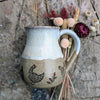 This handmade mug is perfect for chicken lovers! Made from speckled brown clay, it features adorable chicken decals around the bottom and a smooth coral glaze that flows halfway down from the rim.