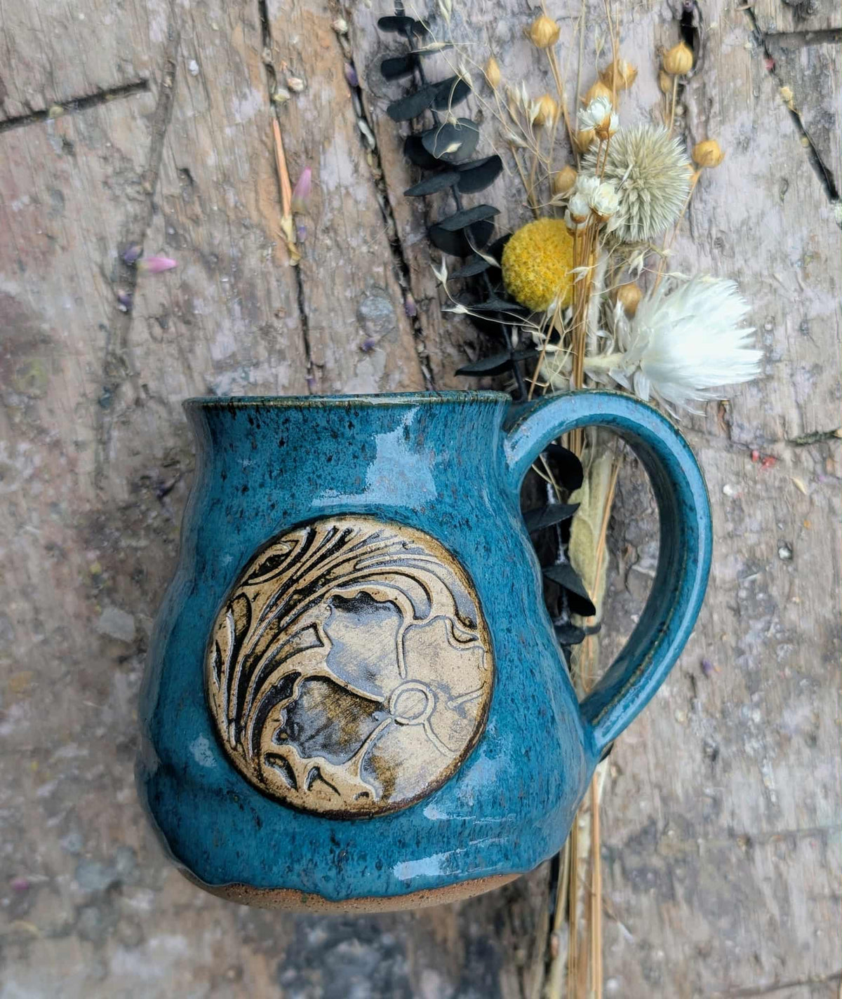 I’m a sucker for tooled leather, and this mug was inspired by my floral-tooked leather purse I picked up in Texas a few years back. The embossed textures pressed into the clay carry that same timeless beauty as my leather purse, while the turquoise glaze adds a rustic western feel—like wide open skies over fields of wildflowers. Both rugged and refined, it’s a little nod to the artistry of the West and to the beauty of God’s creation, captured in every petal and horizon.